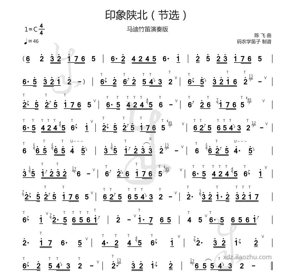 This sheet music is adapted from excerpts of the bamboo flute performance by Ma Di. In the key of