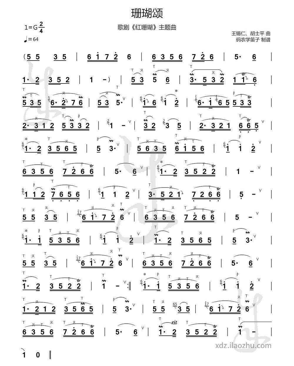 This sheet music is based on Tang Junqiao's adapted bamboo flute version. It is in the key of