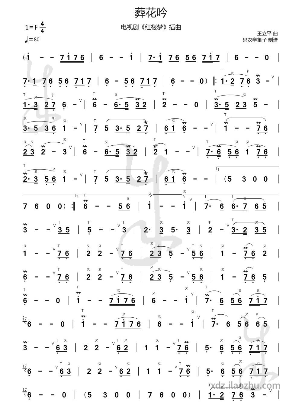 There are numerous versions of The Song of Burying the Fallen Flowers , but given that the dongxiao version is undoubtedly a must-listen for most Chinese flute and dongxiao enthusiasts, this sheet music is based on Tan Yanjian’s dongxiao solo version. The original key is