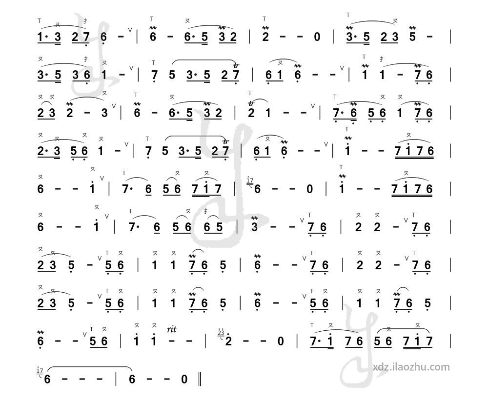 Fmajor, and it can be played on anF-keyeddizi using the fundamental fingering of5. Technically, a bassF-keyeddizi is preferred, though it is not commonly available—anF-keyedsoprano dizi is also usable, albeit with a relatively higher pitch. However, the performance effect can be significantly enhanced by transposing the accompaniment up by two or four keys, then playing it on a bassG-keyedor bassA-keyeddizi (opt for the largest size possible). Additionally, tightening the flute membrane (or replacing it with masking tape) will further improve the sound quality. Of course, performing the piece on anF-keyeddongxiao will yield the most authentic and optimal effect.