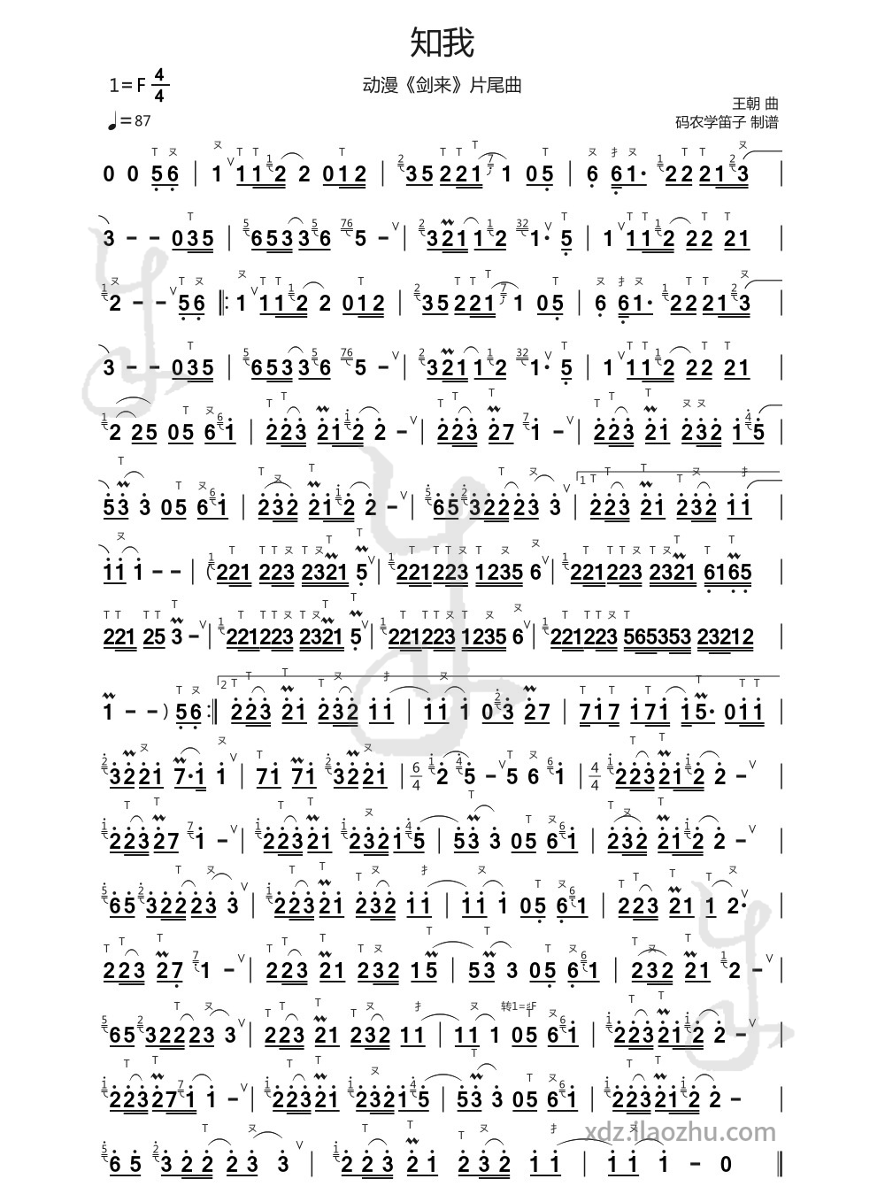 F调为主,最后一段转为F♯调,因此,完整演奏可用F调笛子转F♯调笛子筒音作5实现。